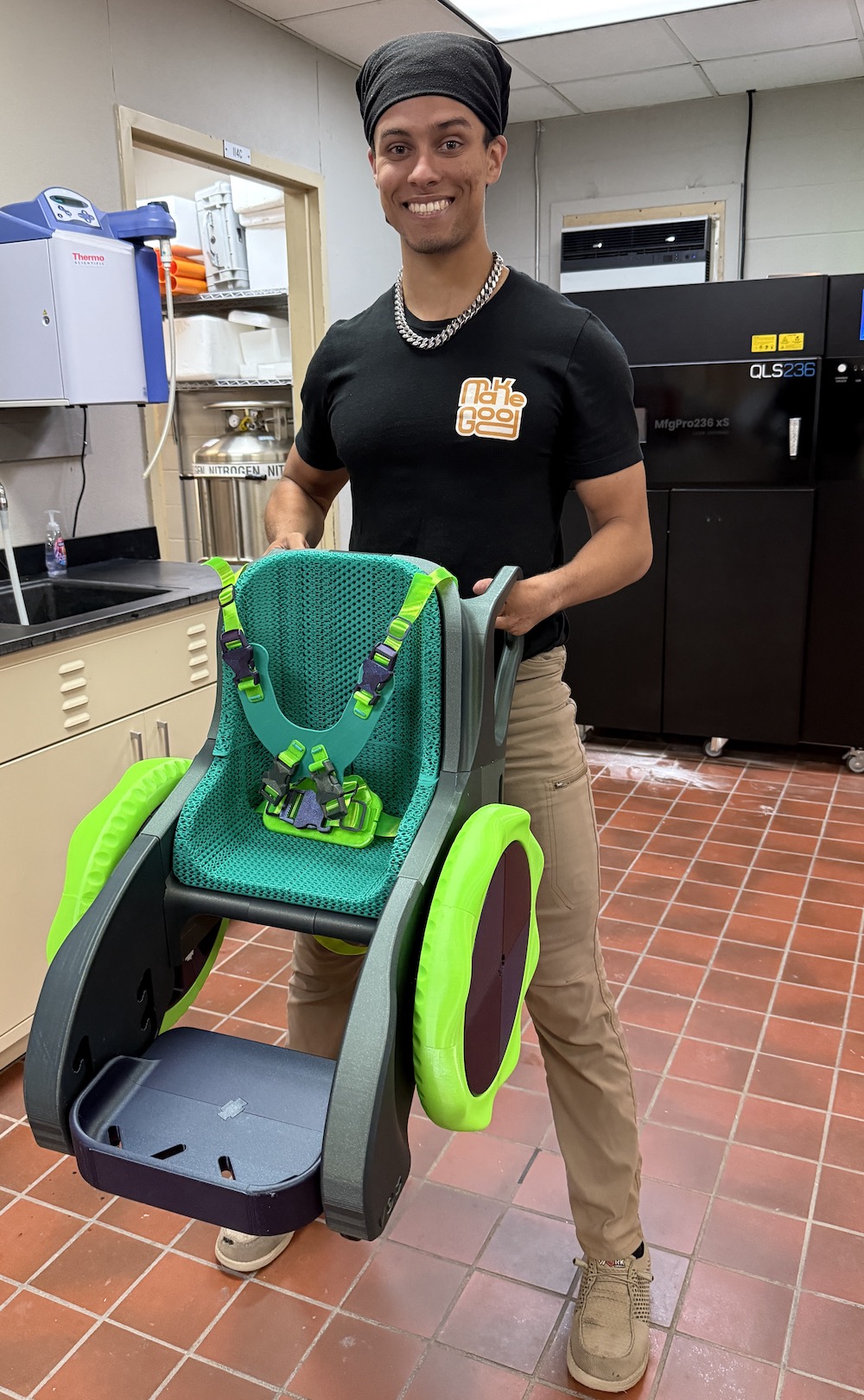 Perhaps MakeGood’s most exciting product is the 3D toddler mobility trainer. Because many toddlers crawl, agencies can downplay the need for mobility devices, despite the importance of movement on brain development and independence. Parents can now print their own while waiting for agencies to provide medical grade devices. The MakeGood device, including wheels, straps and soft cushion can be printed in preferred colors.