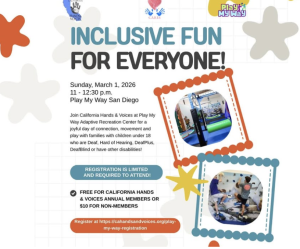 California Hands & Voices families — including those participating in the CARES CPRC Program — are invited to join us for a joyful morning of movement, connection, and play. Families with children who are Deaf, Hard of Hearing, DeafPlus, DeafBlind, and children with other disabilities are all welcome. Mar. 1 11 am–12:30 pm. $10. Play […]