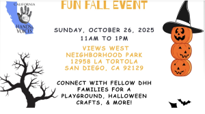 Connect with fellow DHH families for fun on the playground, Halloween crafts and more. Costumes or Halloween shirts encouraged!
