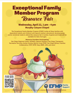 The Exceptional Family Member Program (EFMP) invites all military families with dependents (adults and children) with special medical, educational, developmental, and/or emotional needs to attend this resource fair!