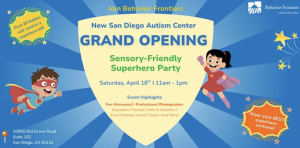 FREE Sensory Friendly Superhero Party. Join Behavior Frontiers at the grand opening of the new San Diego Autism Center. Superhero-themed crafts and activities, face painting and more.